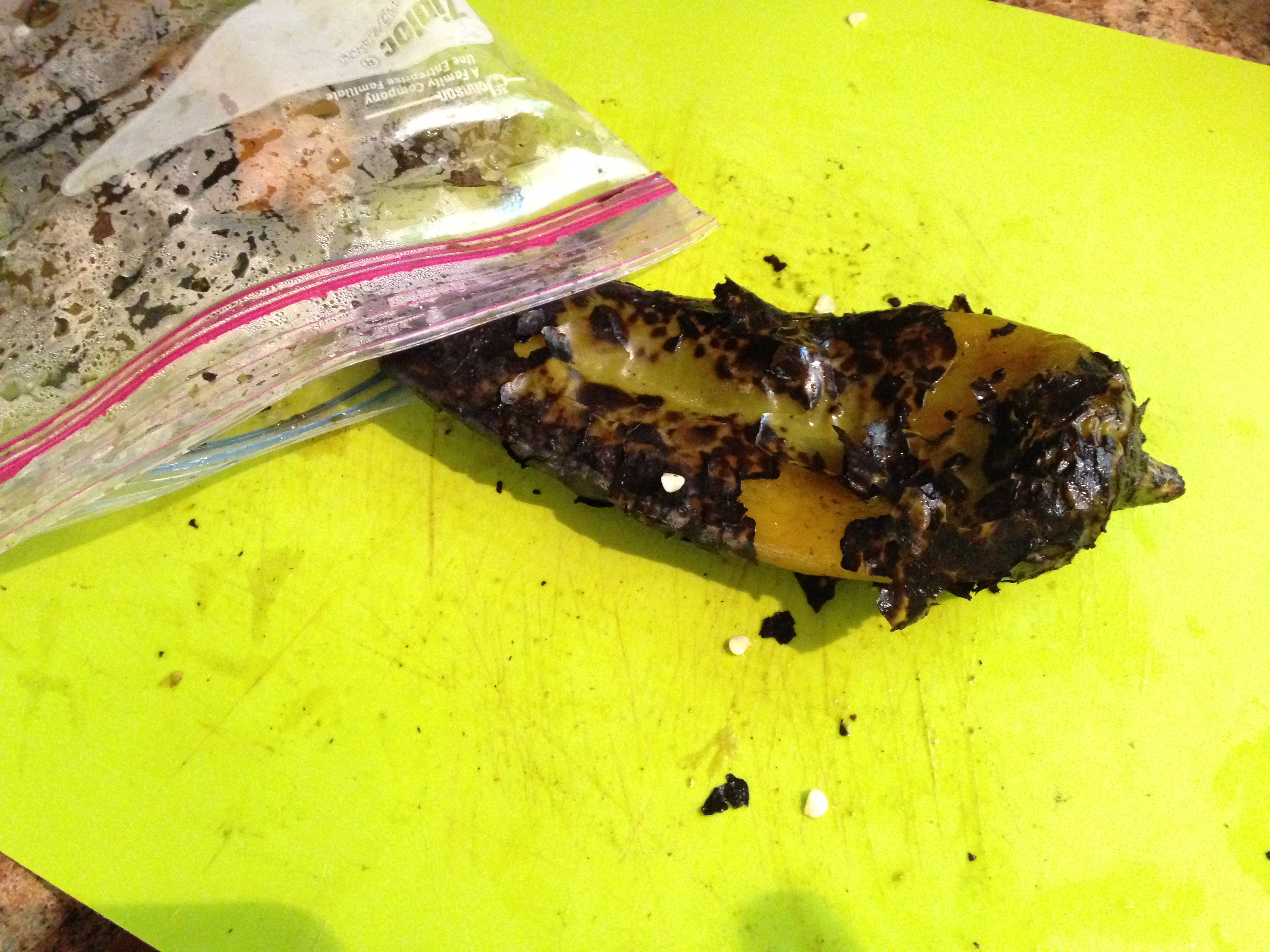 When you buy a bag roasted from a vendor they are still steaming hot, and depending on how much you buy you are instructed to leave them in the bag to steam off the skins anywhere from a half hour, to an hour and a half. Once you get them home scrape off the dry exterior charred skin, take off the tops, slice open to get rid of the seeds, and depending on if you want a lot of heat or not you can take out the interior veins to keep the heat low.